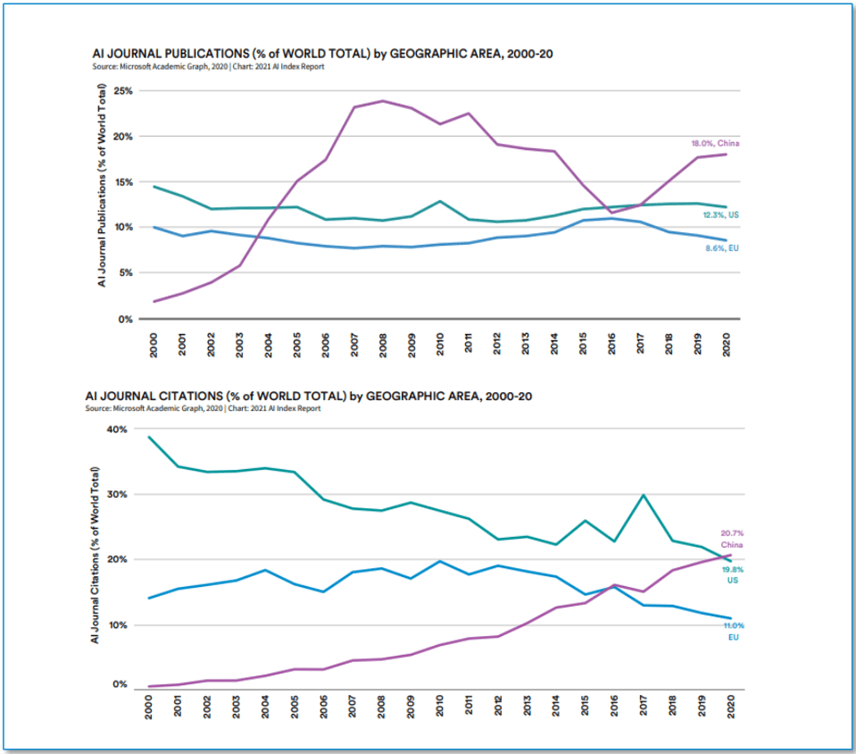 按照斯坦福研究院Human-Centered AI发布的《2021年人工智能指数演讲》,正在三大人工智能强国(中国、美国和欧盟)中,中国的人工智能论文颁发量和被援用量均居全球首位。2020年中国期刊颁发数量以18。0%的比例跨越美国(12。3%)和欧盟(8。6%)。