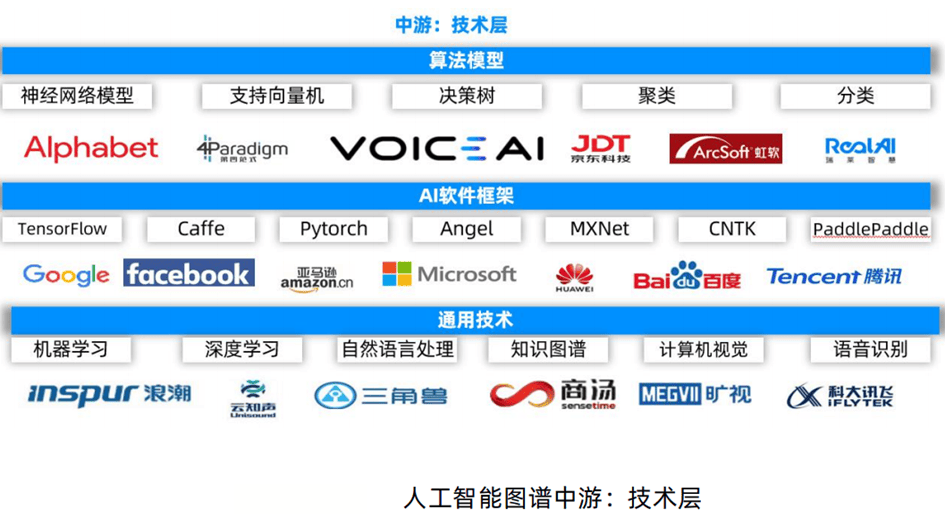 手艺层是AI财产成长的焦点,包罗通用手艺、AI手艺框架以及算法模子等。这一层级依托于海量数据的挖掘处置取机械进修建模,来进行各类使用手艺的开辟,从而处理实践中的具体类别问题。计较机视觉、天然言语处置、语音识别、机械进修、深度进修、学问图谱为这一层级的代表性手艺。劣势企业如谷歌、亚马逊、深度进修底层平台,成立财产现实尺度。