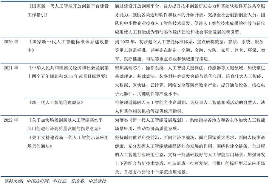 行业持久成长计谋清晰明白,政策沉点支撑。我国2017年提出《新一代人工智能成长规划》,对人工智能的行业成长提出了明白的计谋方针,估计到2030年,我国要构成较为成熟的人工智能理论和手艺系统,财产合作力达到国际领先程度。后续稠密出台了一系列相关的支撑性政策,我国人工智能正在国度计谋层面,别离从手艺冲破、人才培育、立异平台、伦理要求、场景使用等方面,构成了一套分析、系统的人工智能扶植和成长的顶层设想。近期的政策中愈加沉视人工智能的场景使用,通过人工智能取实体经济的深度融合,培育新的经济增加点。
